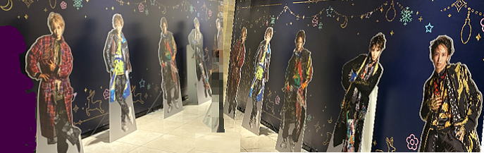 アプローズタワー1階ガレリアのクリスマスツリー横のトップスター5人の巨大タペストリー。